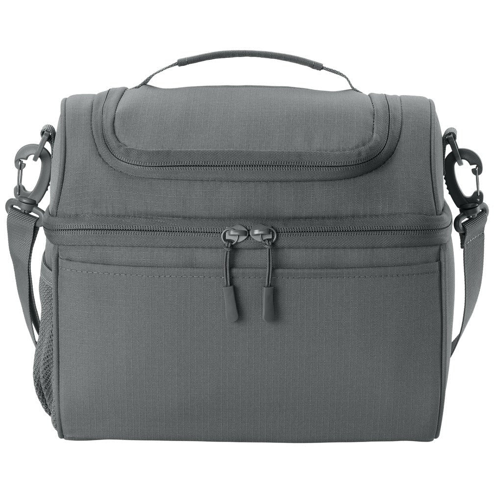450D ripstop polyester Leak-resistant PEVA lining Web top handle Insulated domed top compartment Zippered, insulated main compartment can hold up to six 12-ounce cans Front slip pocket Mesh side pocket Removable, adjustable shoulder strap Dimensions: 9.75'h x 10.5'w x 7'd Capacity: 671.3 cu. in./11 L Weight: 0.75 lbs./0.34 kg Note: Bags not intended for use by children 12 and under.